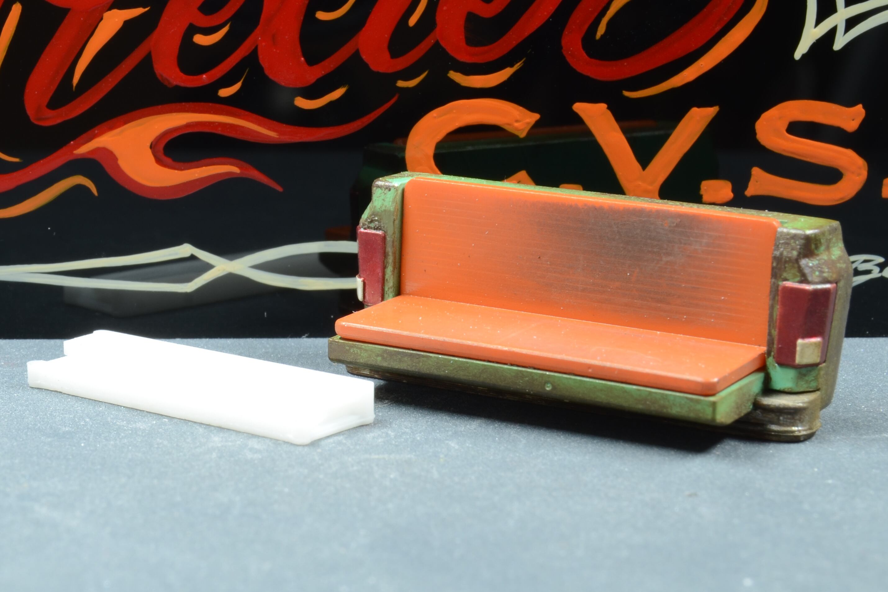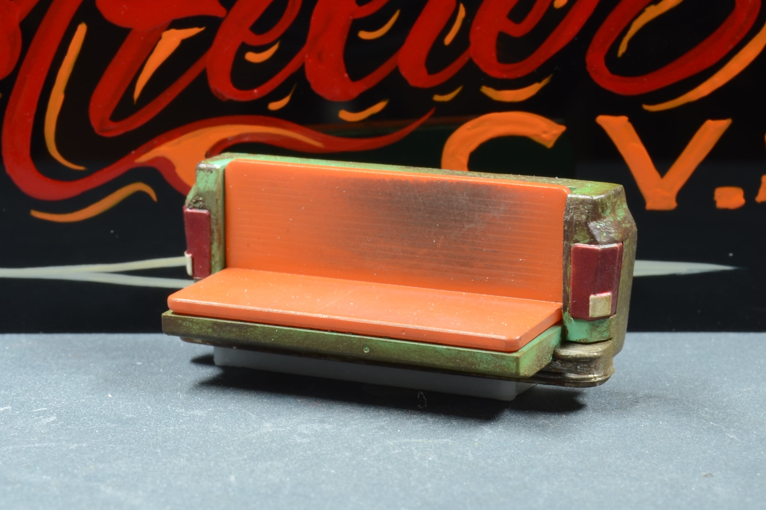 '80sアメリカントラックのリアゲートをアレンジしたソファを1/64スケールで再現。